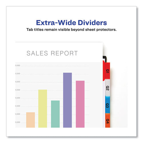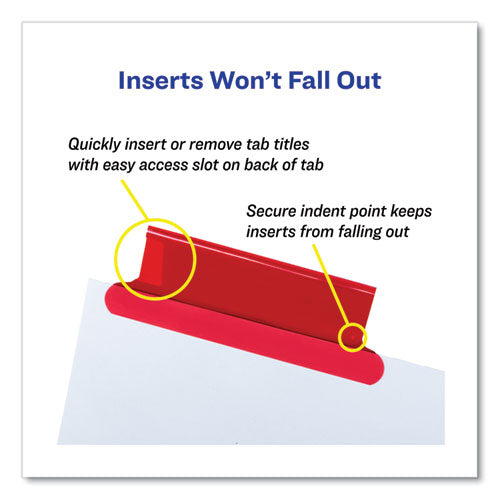 Big Tab dividers are bigger providing 50% more writing space than standard tabs. Special tab design allows easy insertion and removal, but keeps insert securely in place. Reinforced binding edge. White or buff paper dividers with clear or multicolor