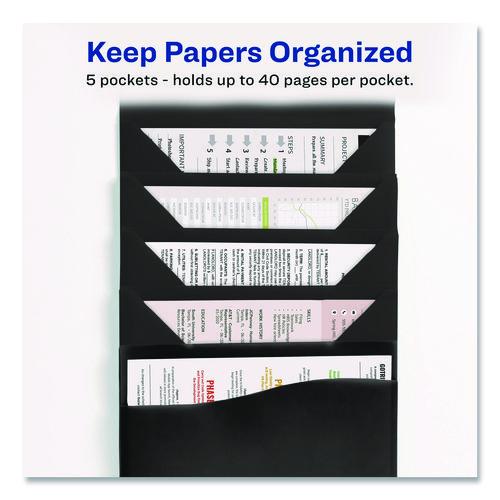 - Five pocket file expands as each section slides apart for easy access and visibility.