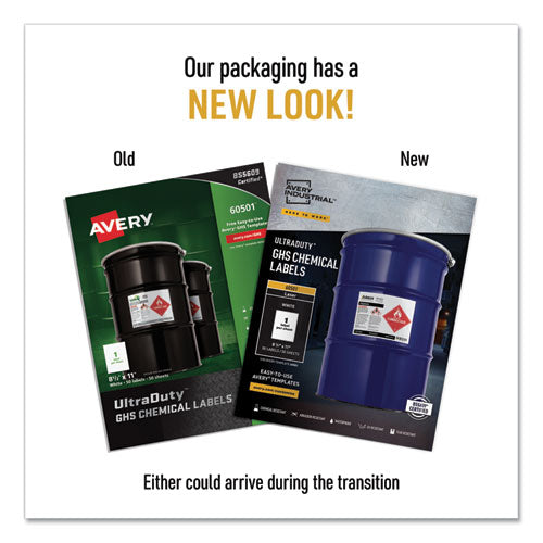 Waterproof and resistant to chemicals, abrasion, sun, tearing, and harsh temperatures. High-performance adhesive. Ideal for labeling drums, totes, pails, jugs and bottles. For Laser Printers—Letter-sized, 8.5 x 11 sheets. Shape: Rectangular; Label
