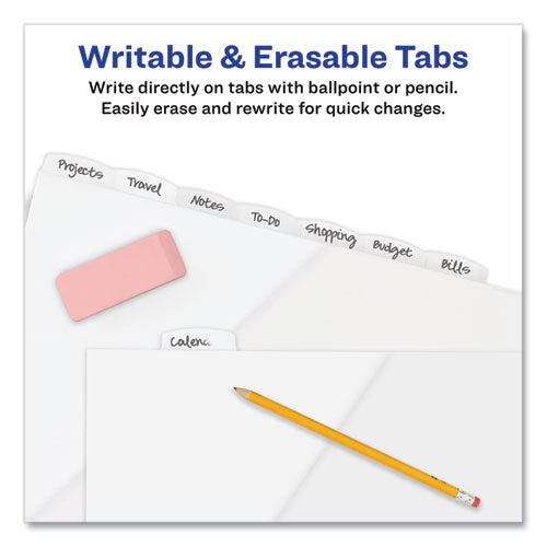 Durable plastic allows for frequent reference. Multicolored dividers have stylishly shaped tabs. Customize tabs using a ballpoint pen or pencil. To reuse, just erase and write again. Use the Corner Lock with expandable pocket or slash pockets for sto