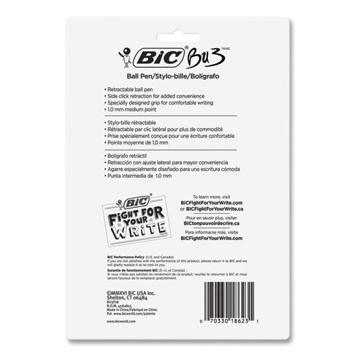 SKU: BICBU3P18BLK Manufacturer: BIC CORP. Mfr. Part Number: BU3P18-BLK Brand Name: BIC® Alternate Part Numbers: BICBU3P18BLK, BIC-BU3P18BLK, BU3P18-BLK, 00070330531178 (GTIN) Country of Origin: CN (CHINA) TAA Compliant: No UNSPSC Code: 0044121704 Unit of Measure: PK (Package of 18) UPS Shippable: Yes Air Shippable: Yes Item Dimensions: 8.18 in. x 5.59 in. x 1.38 in. Weight: 0.5000 lb. Expiration Date: No Environmental Properties