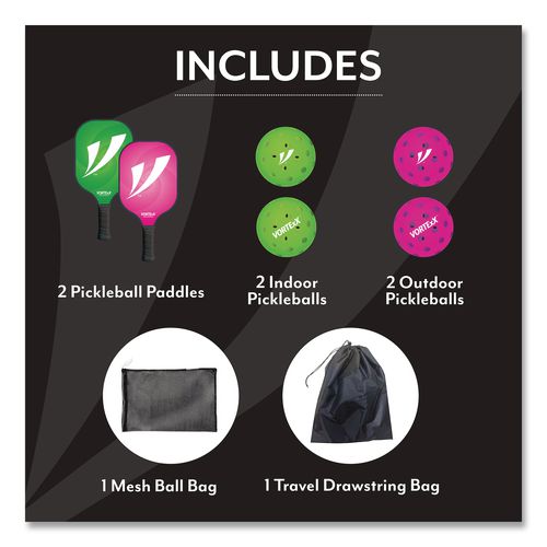 The VORTExX Fiberglass Pickleball Paddle Set is the ultimate solution for pickleball players looking for quality and convenience. This complete set includes two durable fiberglass paddles, two indoor balls, two outdoor balls, a mesh ball bag and a ca