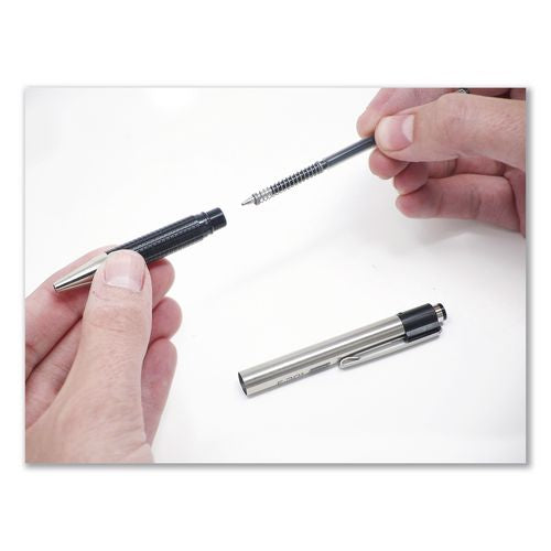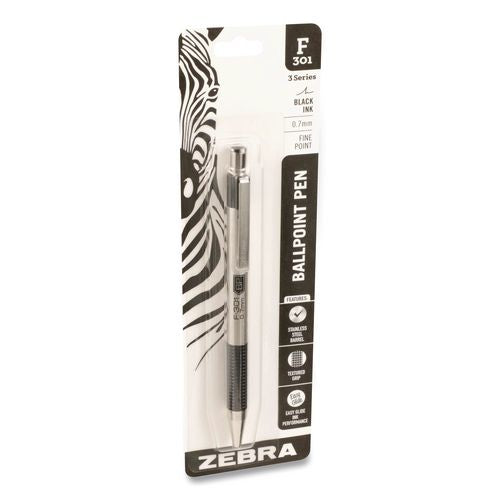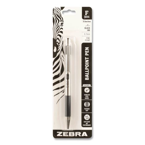 F-301 Retractable Ballpoint Pen features a stainless steel barrel and nonslip grip. Nonslip grip color matches ink color. Refillable with Zebra's F-Refill.