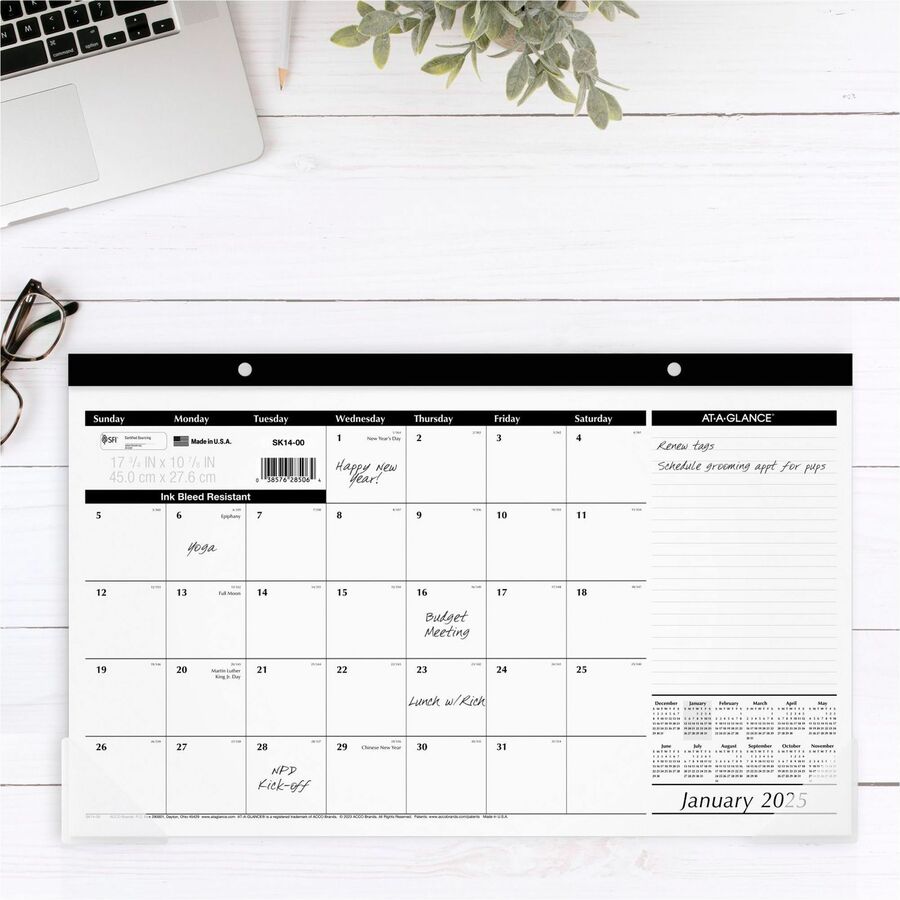 This compact desk pad is ideal for smaller workspaces and helps you plan ahead. Displays one month per page with unruled daily blocks for marking key dates, plus a notes column and full year calendar reference for date checking. Printed on high-quali- Compact size is perfect for smaller workspaces, and it protects your desk surface, too.
