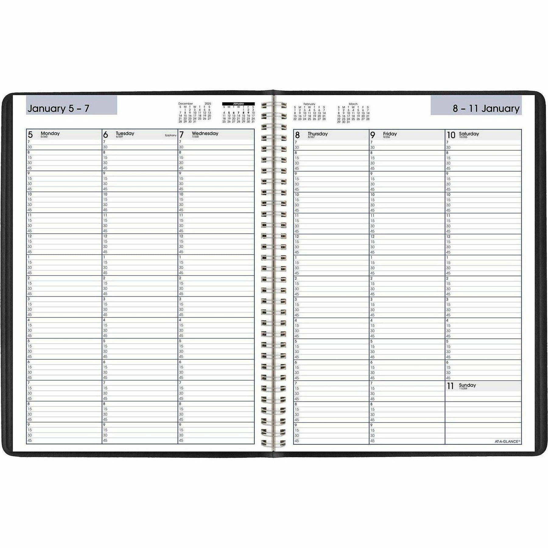 Plan your week in easy to manage intervals. One week per two-page spread. Column-style appointments. Current and future months reference. High-quality paper with superior ink bleed resistance. Vertical-Column Format-Past, current and two future month