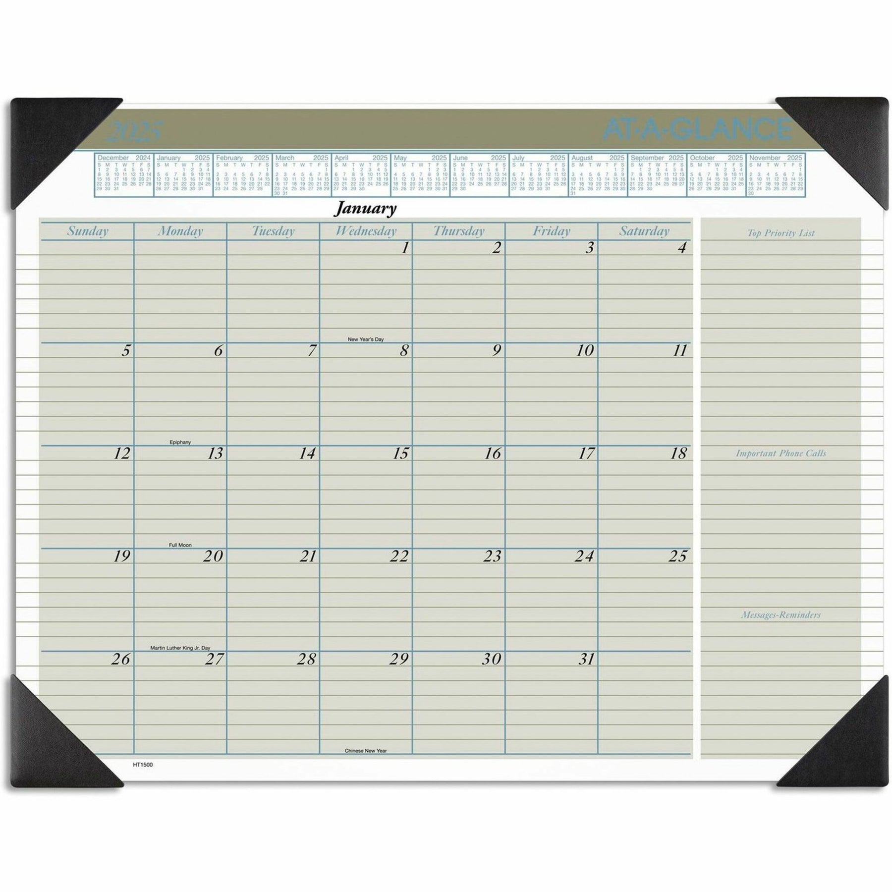 Track your schedule, priorities, phone calls and messages. Durable backboard provides a sturdy writing surface. One month per page with ruled blocks and lined notes space. Full-year calendar reference. Bonus pages: current- and future-year reference- Track your schedule, priorities, phone calls and messages.
