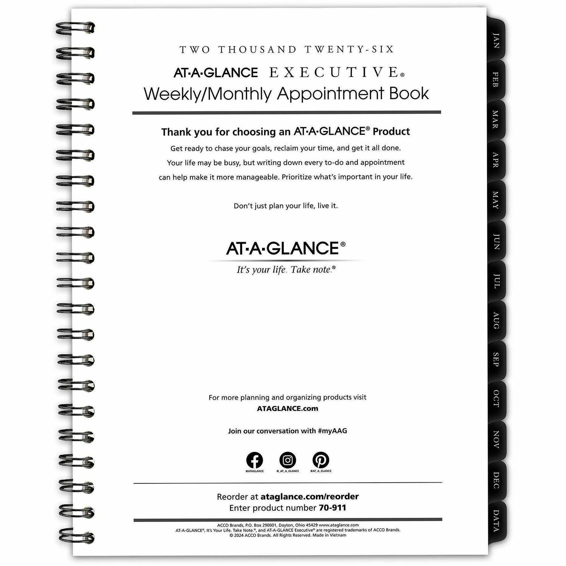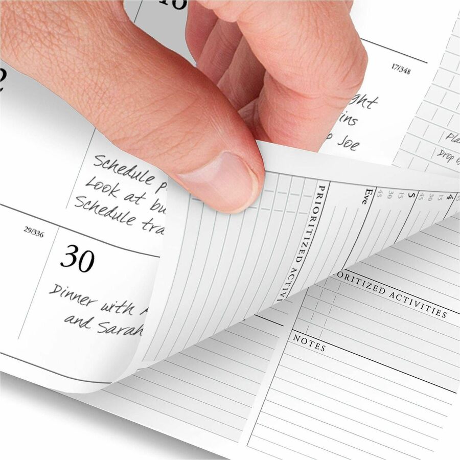 Premium paper resists ink bleed. Weekly: one week per two-page spread, column-style appointments. Monthly: one month per two-page spread with unruled blocks; past and future months reference; Reinforced tabs. Removable telephone and address book. Dat- Premium paper resists ink bleed.
