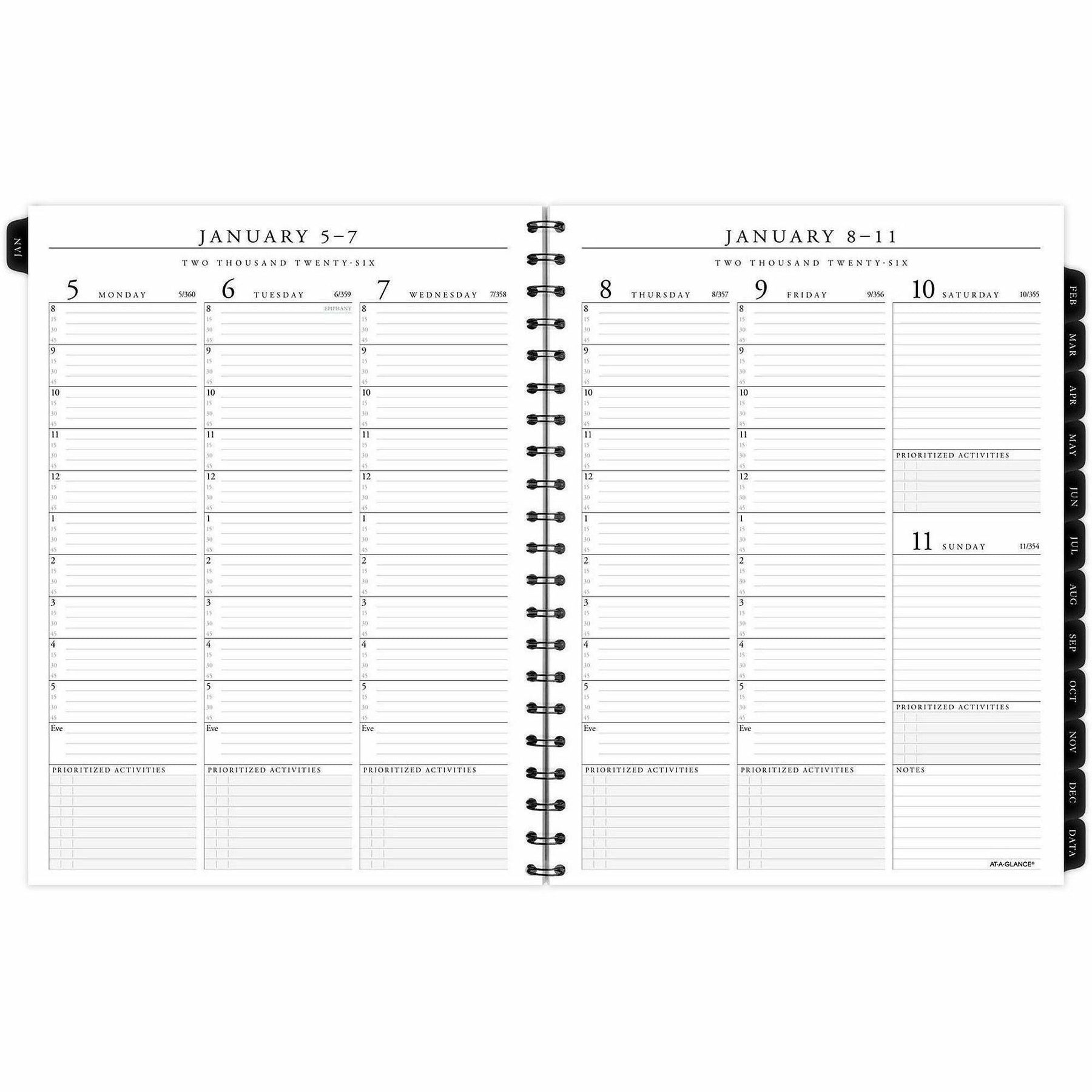 - Monthly: one month per two-page spread with unruled blocks; past and future months reference; Reinforced tabs.