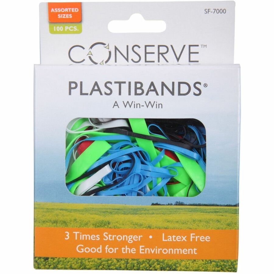 Latex-free polyurethane bands won't discolor or deteriorate. Lab-tested bands are almost three times stronger than an average rubber band of comparable size yet weighs 40 percent less. Assorted vibrant colors are ideal for color-coding. PlastiBands come in handy dispenser package.