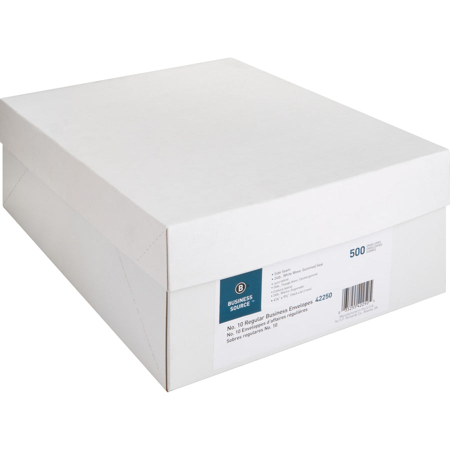 No. 10 business envelopes offer a contemporary style, side seam, fully gummed flaps and sturdy, 24 lb. white wove paper. They open along the top of the long end. Envelopes are good for everyday mailing.