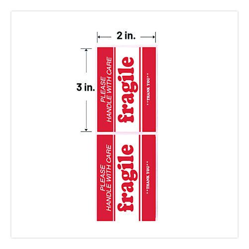 Draw attention to what matters. Pressure-sensitive permanent adhesive. Pre-Printed Message”Fragile-Please Handle with Care-Thank You. Shape: Rectangular; Label Size - text: 2 x 3; Design: High-Contrast; Label Color(s): White/Red.