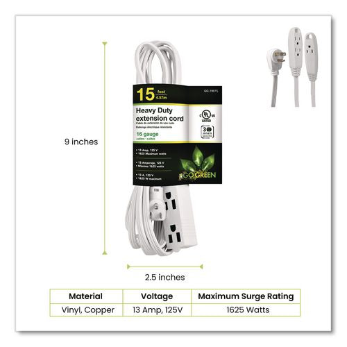 GoGreen Power GG-19615 3 Outlet Indoor Extension Cord, 15 ft, 13 A, White