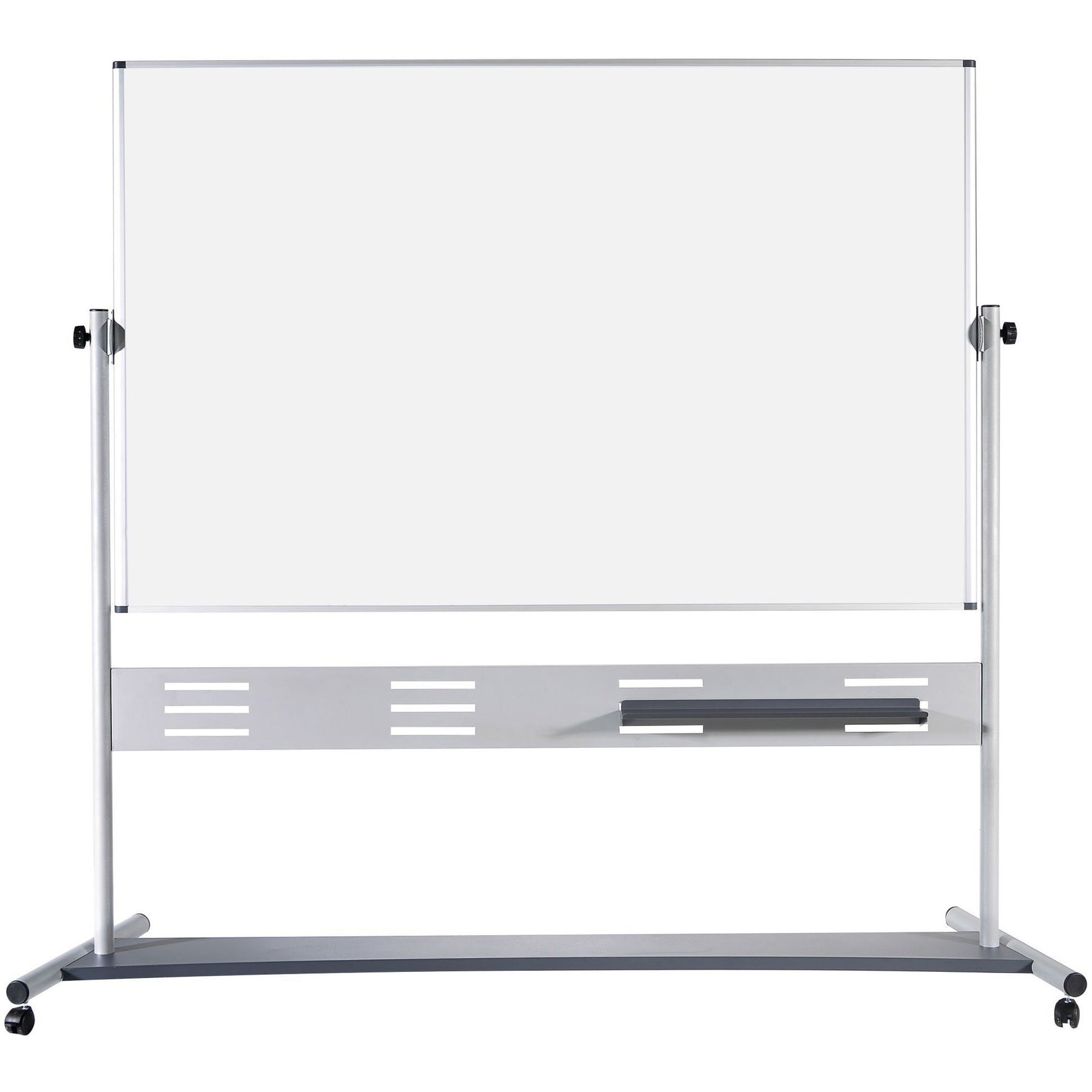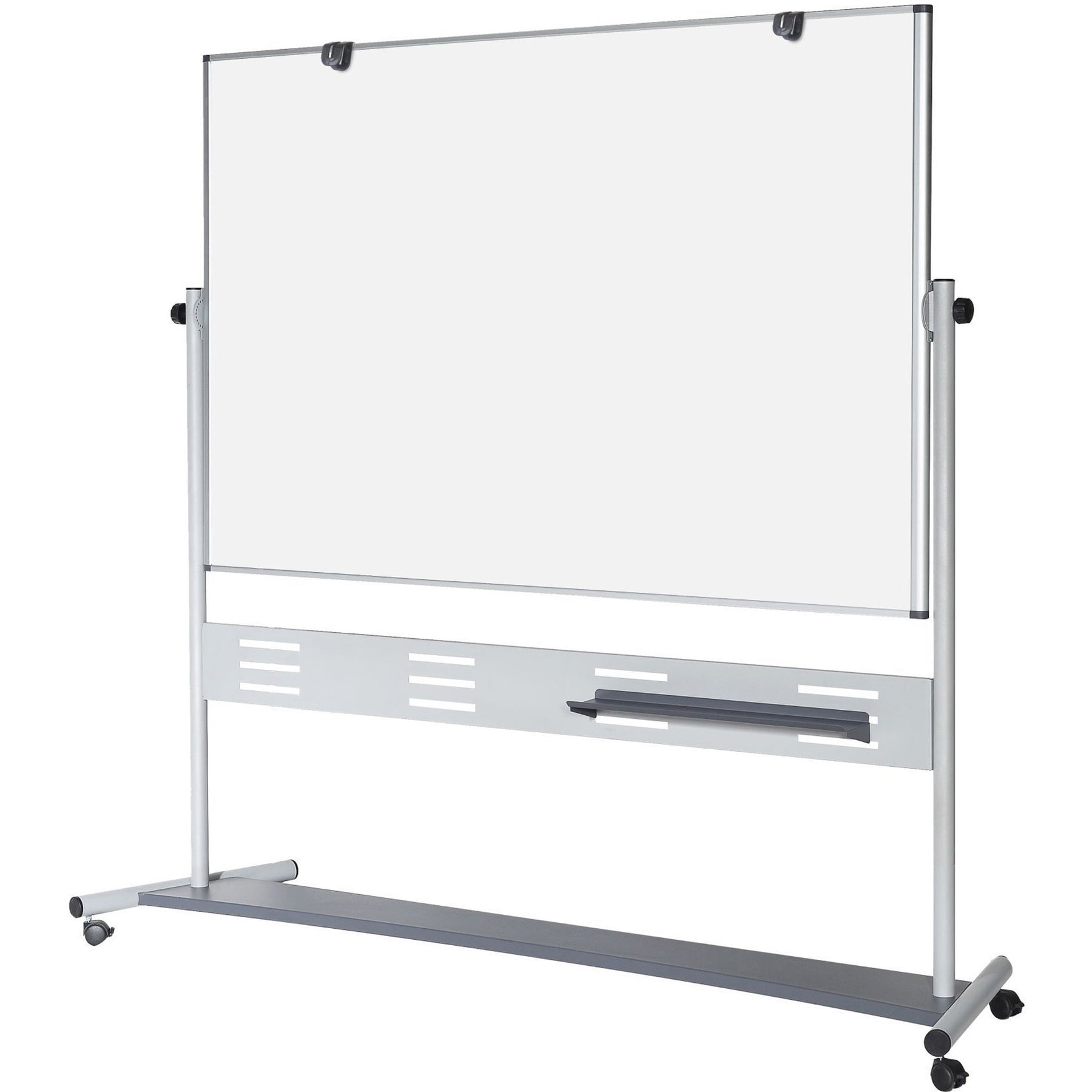 Revolving double-sided dry erase mobile presentation easel is heavy-duty and reversible. It features a Magnetic Gold Ultra lacquered steel surface on both sides. Extra-large repositionable steel pen tray can be positioned in several places. Tubula