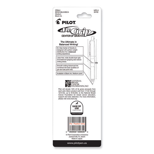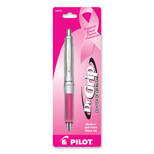 Pilot® 36192 Dr. Grip Center of Gravity Breast Cancer Awareness Ballpoint Pen, Retractable, Medium 1 mm, Black Ink, Silver/Pink Barrel