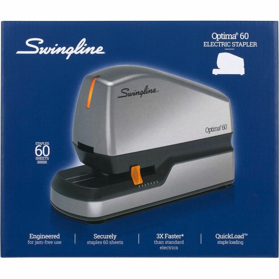 Quiet yet powerful, this Optima 60 Electric Stapler is the perfect choice for large stapling jobs. Electric model delivers quick, accurate stapling for any office or home. It is three times faster compared to Swingline Optima 20 Electric Stapler for greater productivity. Use Swingline S.F. 4 Premium Staples (not included) or Optima High-Capacity Staples (included) for fast, high-volume stapling that is jam-free guaranteed. It staples up to 60 sheets when using Optima High-Capacity Staples and up to 25 sheets with Swingline S.F. 4 Premium Staples. QuickLoad technology allows easy staple reloading. Eject the empty staple magazine with the press of a button. Low-staple indicator alerts when staples are running low. Adjustable depth guide helps accurately position staples. Suction cup feet hold the stapler in place. Stapler comes with a starter pack of 500 Optima High-Capacity Staples.