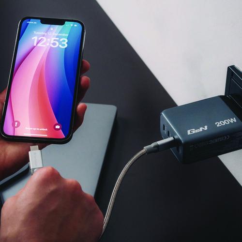 Gallium Nitride (GaN) technology delivers highpowered, fast, efficient charging, generates less heat and allows for smaller and lighter chargers, making them ultraportable. The GNC-200 charger is made with high-quality, flameresistant materials and f