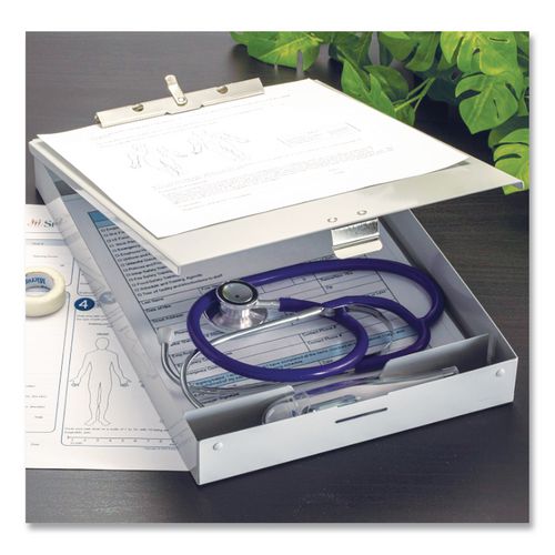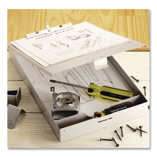 Complete paperwork away from your desk with this silver forms holder. The durable metal clip secures paper in place as you write, while the strong aluminum construction stands up to repeated use. An interior storage compartment offers convenient stor
