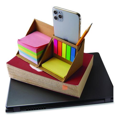 Recycled storage cube that unfolds to display an assortment of sticky notes and a pen holder. Add a touch of "you" to each cube that comes as a blank canvas with unlimited possibilities for personalization. Perfect for office, home, school and classr