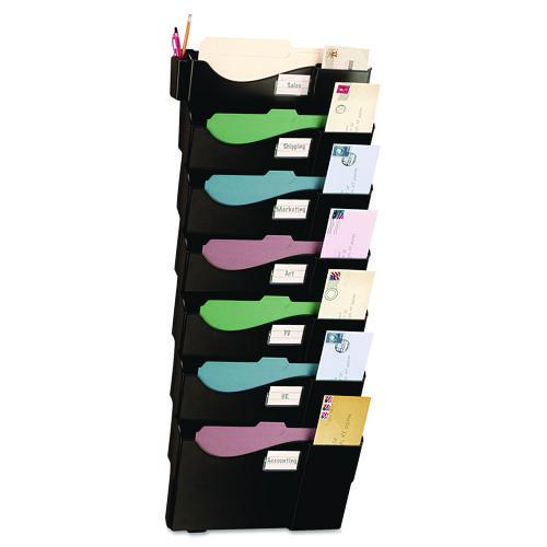 A great organizer for office, cubicle or mail room, this filing system includes a pencil cup and compartment for cards and envelopes for easy retrieval. System may be expanded with Officemate 21722 add-on pockets (sold separately). Includes ID labels- Filing system includes a pencil cup and compartment for cards and envelopes.