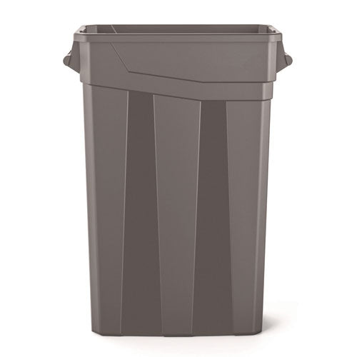 The 23 gallon resin slim trash can with handles by Suncast Commercial ® was manufactured to be tough but also functional. This slim can is designed to fit in the tightest of areas to conserve space and its heavy-duty polymer construction allows for s