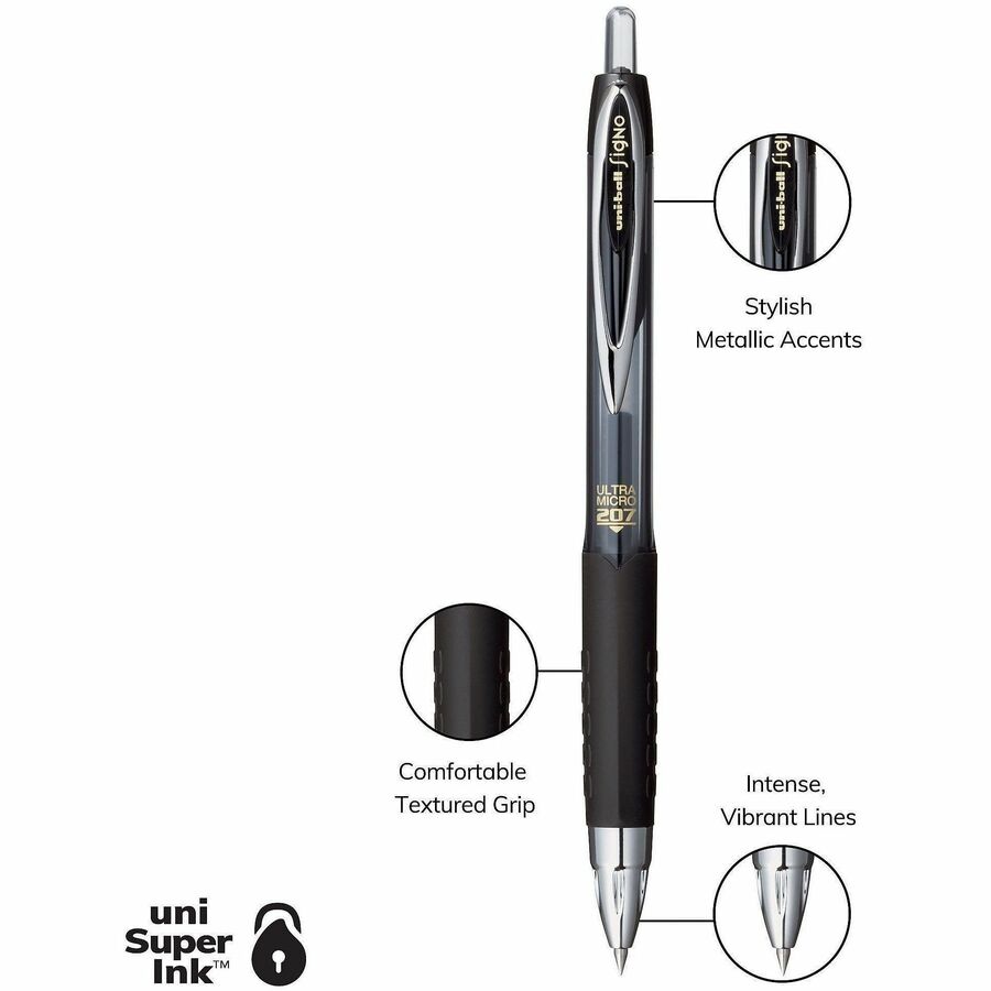 Stock your office, home or classroom with 207 Retractable Gel Pens. Stainless steel tip resists bending and breaking. Even-flowing, pigment-based gel ink delivers a smooth writing experience for intense, vibrant lines, ensuring every mark is communicated. Use retractable pens for everyday writing tasks and important signatures, trusting quick-drying Super Ink. Innovative, uni Super Ink technology effectively entraps liquid ink into the paper, producing fraud-resistant, fade-resistant and water-resistant documents that prevent check washing and bleaching. Translucent window lets you see when your ink is low to avoid running out. Textured grip offers comfort and control. Sleek design with modern metal accents adds a stylish touch to your writing supplies.