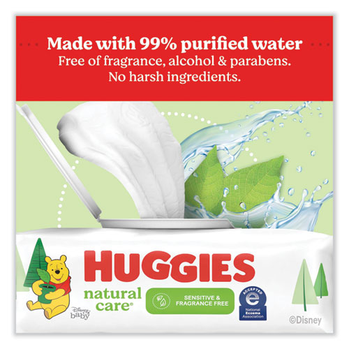 Huggies® Natural Care® Sensitive Baby Wipes are plant-based wipes, made with 99% purified water and 1% skin essential ingredients for a gentle clean. Infused with aloe and vitamin E, the unique base sheet locks-in and absorbs the mess to help keep