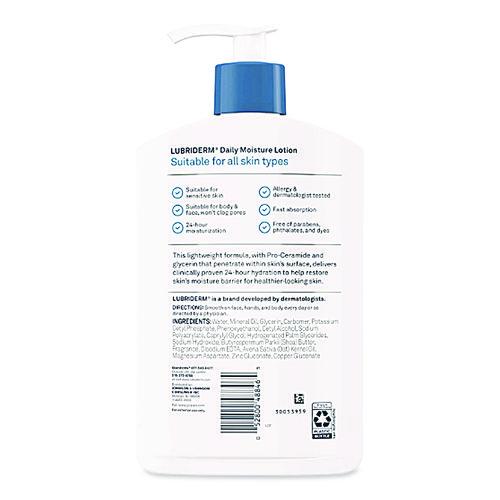 Ideal for normal-to-dry skin types, Lubriderm Daily Moisture Fragrance-Free Body Lotion is an ideal solution to replenish and moisturize dry skin that's suitable for the whole family. From a dermatologist developed brand, this daily moisturizing loti- Pump bottle of lotion is an ideal solution to replenish and moisturize dry skin that's suitable for the whole family.