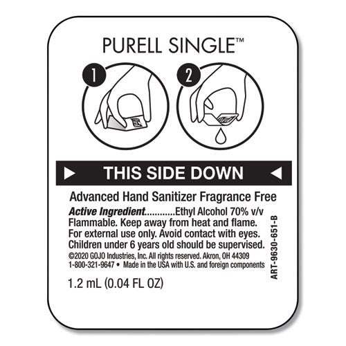 PURELL SINGLES Advanced Hand Sanitizer Gel Packets, also known as PURELL PERSONALS, are ready in a pinch-an easy, compact way to sanitize your hands on the go. Hand Sanitizers Type: Gel; Color(s): Clear; Volume Capacity: 1.2 mL; Product Packaging: