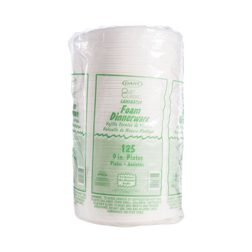 Dart® 9PWQR Quiet Classic Laminated Foam Dinnerware Plate, 9" Dia, White, 125/pack