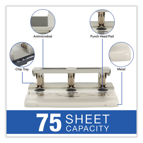 High capacity heavy-duty punch increases productivity by cleanly punching three holes in as many as 75 sheets. Metal construction and one-touch punch pad extend the life of the punch itself and the punch heads. Antimicrobial to repel bacteria on the