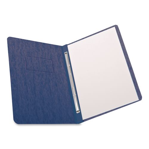 Sturdy rigid paperboard stock with smooth, distinctive finish. Tape-reinforced hinge holds up to frequent referencing. Embossed title panel on front cover. Acid-free. Pressboard Covers. Front Cover Color(s): Dark Blue; Color Family: Blue; Back Cover