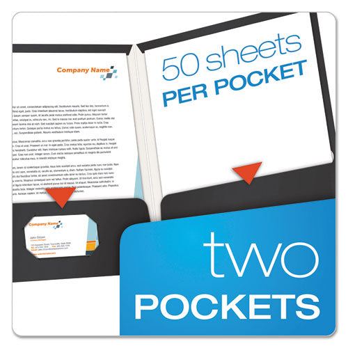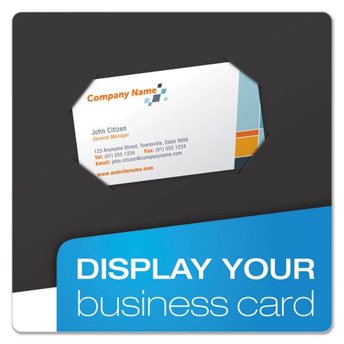 Bright, laminated high-gloss covers get attention. Die-cut business card holder on inside front cover keeps contact information at hand. For 11 x 8.5 sheets. Holds up to 100 sheets (50 per pocket). Front Cover Color(s): Black; Color Family: Black; Ba