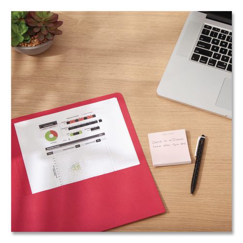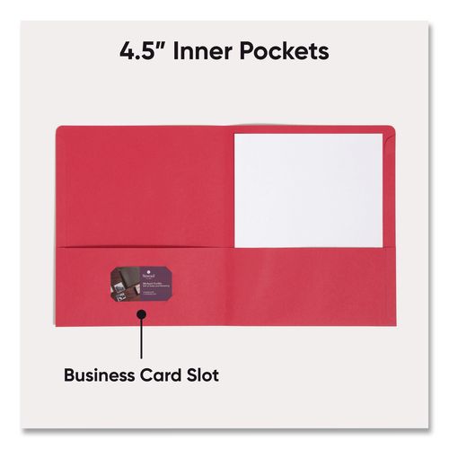 Large pockets safely hold documents, photos or certificates for easy transport while keeping the material immediately accessible. The left pocket is die cut for a title or business card. Heavyweight textured stock makes a distinctive impression. Two