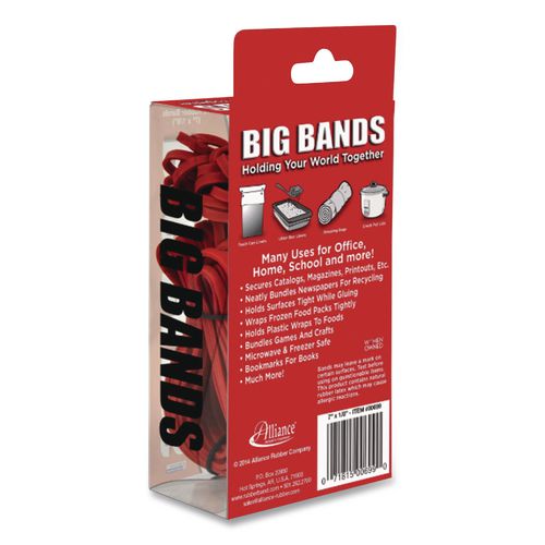 These 7" x 1/8" Big Red bands are ideal for organizing everything at home, at school or in the workplace. Microwave and freezer safe. Approximate Band Count: 48; Band Trade Size: 117B; Band Gauge: 0.07"; Band Width: 0.13".