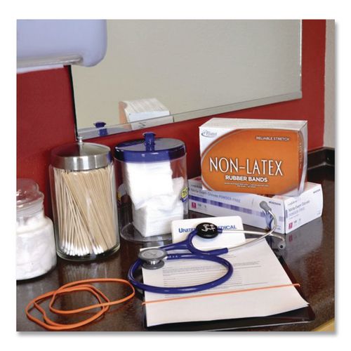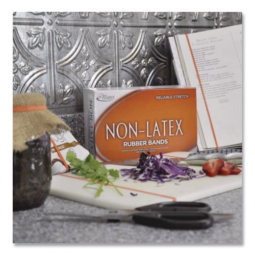 Non-latex rubber bands are made from synthetic rubber and are recommended for home, school, workplace, government and medical facilities. Approximate Band Count: 250; Band Trade Size: 117B; Band Gauge: 0.04"; Band Width: 0.13".