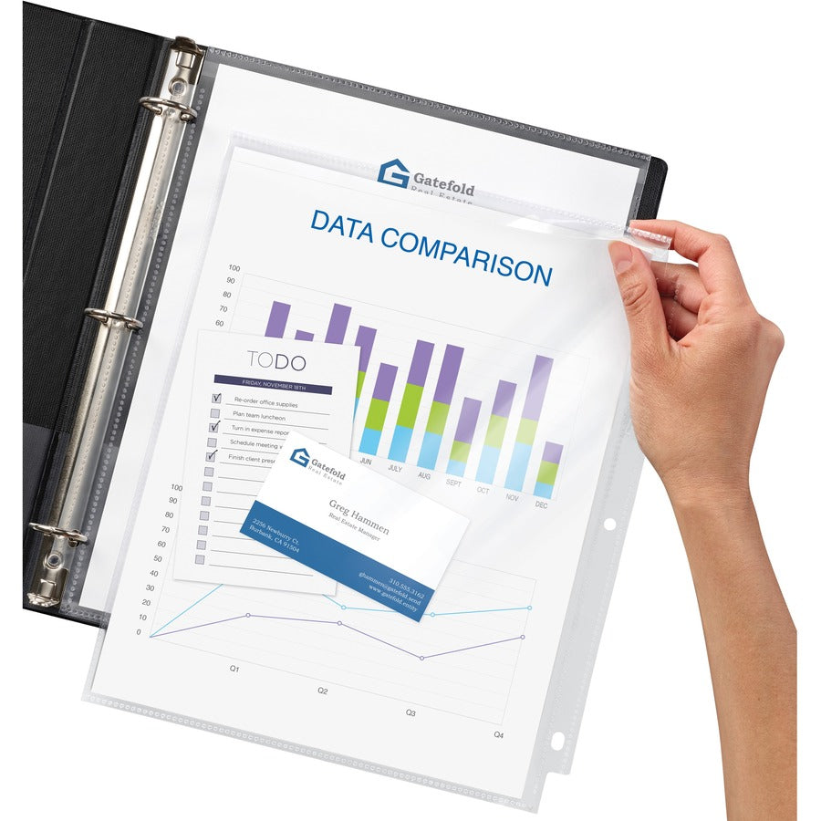 If you're looking for tip-top protection for your documents, look no further than these Diamond Clear Secure Top Sheet Protectors. Each three-hole punched sheet protector features a convenient top flap that secures the contents so you can store papers in nonstandard sizes with confidence and rest easy knowing your important document won't accidentally slip out of its protective sleeve. Super-heavyweight polypropylene is designed to withstand frequent use in your binder and is acid-free and archival-safe to provide long-term protection. For clarity, security and strength, it's hard to top these sturdy sheet protectors.