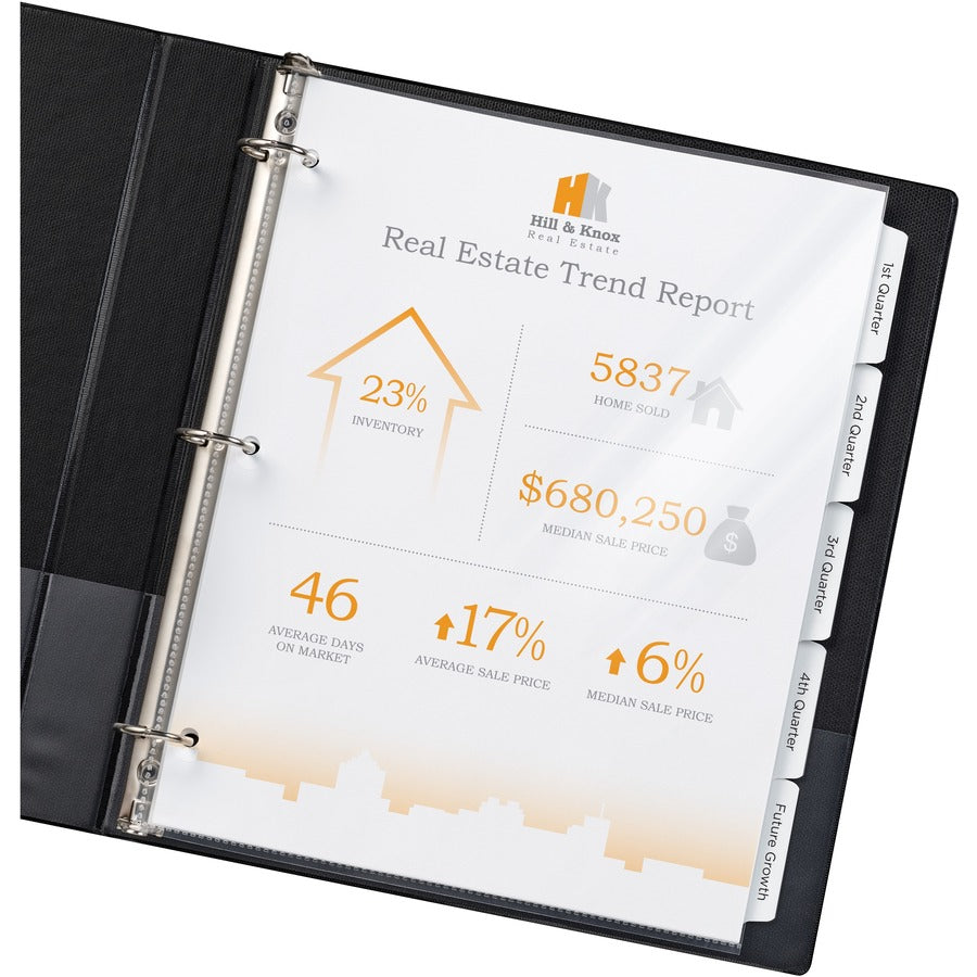 Protect your papers without obstructing your tab dividers. These Page Size Sheet Protectors offer sturdy protection of your three-hole punched pages without an extended binding edge that makes tabs hard to find. Durable material withstands the rigors