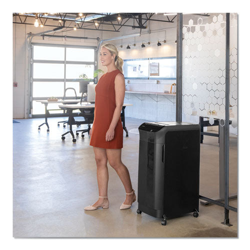 This shredder can automatically shred up to 550 sheets of paper with the touch of a button or manually shred up to 14 sheets into 397 (5/32" x 1 1/2"; Security Level P-4) cross-cut particles. This machine also safely shreds CDs/DVDs, credit cards, st