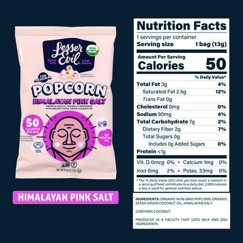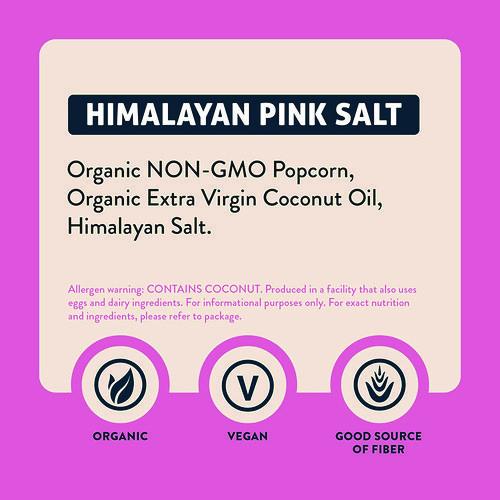 The classic. Our Himalayan Pink Salt popcorn is made with just three simple ingredients: organic popcorn, organic extra-virgin coconut oil and Himalayan salt. No processed vegetable oils. Food