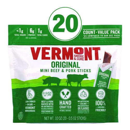 Get smart with your snacking with Original Beef and Pork snack sticks from Vermont Smoke and Cure. These pouches of individually wrapped beef and pork sticks are seasoned with garlic, mustard s