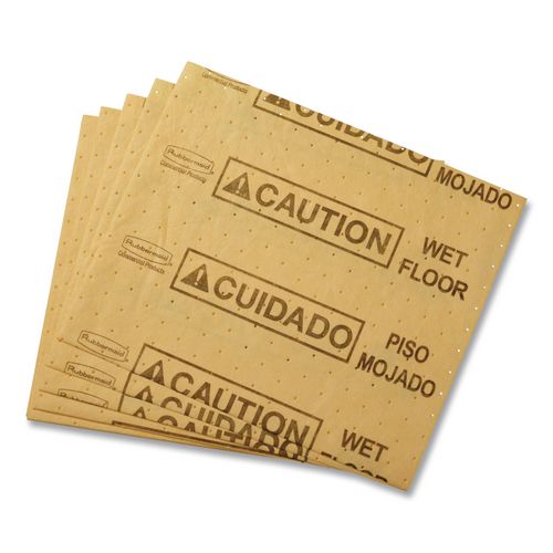 The Rubbermaid Commercial Mini Over the Spill Absorbent Pads Tablet contains 25 absorbent pads that each have a triangular "Caution" symbol as well as the words "Wet Floor" in both English and Spanish. These water and oil absorbent pads are a great w