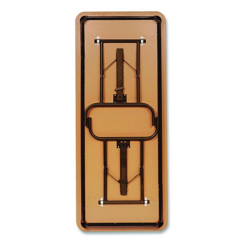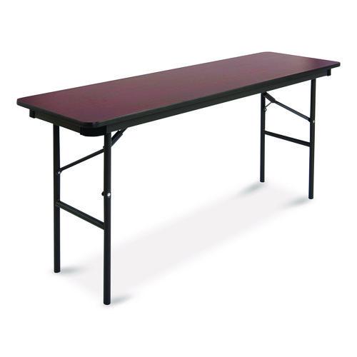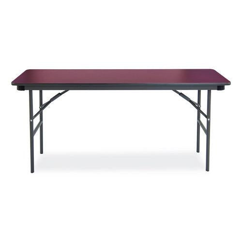 Wear-resistant, 3/4" thick melamine top with vinyl T-mold edge. Melamine sealed underside helps prevent moisture absorption. Full perimeter steel skirt support with plastic corners to protect surface when stacking. 1" diameter, heavy gauge steel legs