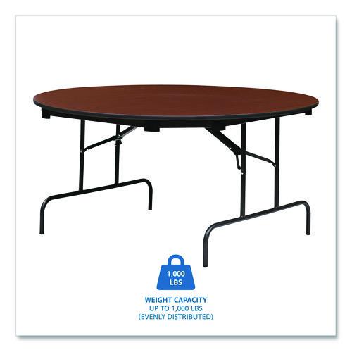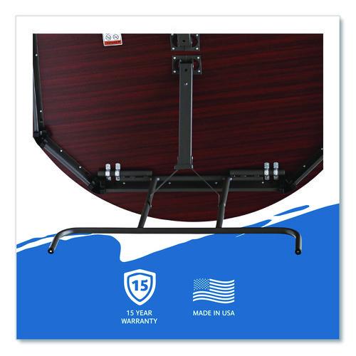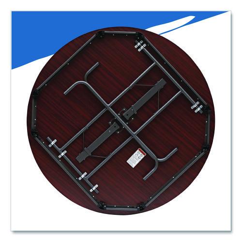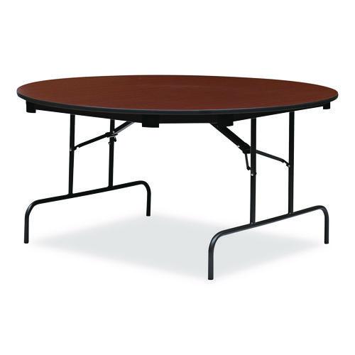 Wear-resistant, 3/4" thick melamine top with vinyl T-mold edge. Melamine sealed underside helps prevent moisture absorption. Full perimeter steel skirt support with plastic corners to protect surface when stacking. 1" diameter, heavy gauge steel legs