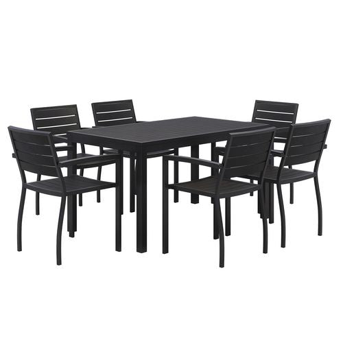 KFI Studios Eveleen Outdoor Patio Table with Six Black Powder-Coated Polymer Chairs, 32 x 55 x 29, Black