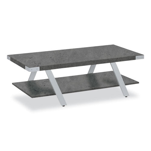 Mirella Coffee Table features a contemporary design with slanted metal legs for a one-of-a-kind look. The unit comes complete with a bottom shelf for storage. Coordinates with Mirella Conference and Reception designs for a cohesive and professi