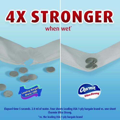 Get sparkly clean with Charmin Ultra Strong. It's 4X stronger when wet and has a diamond weave texture. It's woven like a washcloth and it holds up when you wipe. It even cleans better so you can use less and go longer without changing the roll. We a