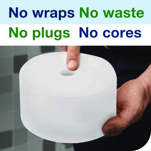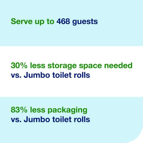 - Refill less and avoid paper shortages as this coreless toilet paper serves up to 468 guests when used with a four-roll dispenser.