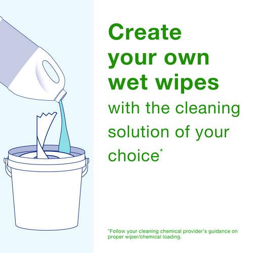 Make your own wet wipes with these Chem-Ready buckets. Simply place the roll of dry wipes into the compatible bucket and add your preferred water-based cleaning solution, sanitizer, or disinfectant cleaning chemical. The buckets are high capacity and