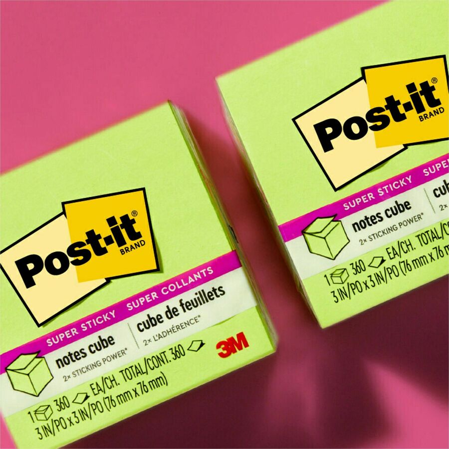 Post-it Super Sticky Notes Cube offers the convenience of Super Sticky Notes in a convenient cube. Cube format keeps notes handy on top of your desk or counter, and they won't get lost in the clutter. Post-it Super Sticky Notes feature a unique adhesive so your notes will stick securely to more surfaces. Stick your notes where they'll really get noticed - like monitors, doors and walls. Super Sticky Notes hold longer and stronger than original notes yet remove cleanly. The cube includes multiple colors. Super Sticky Post-it Notes are recyclable, and the paper in Post-it Notes is sourced from certified, renewable and responsibly managed forests.