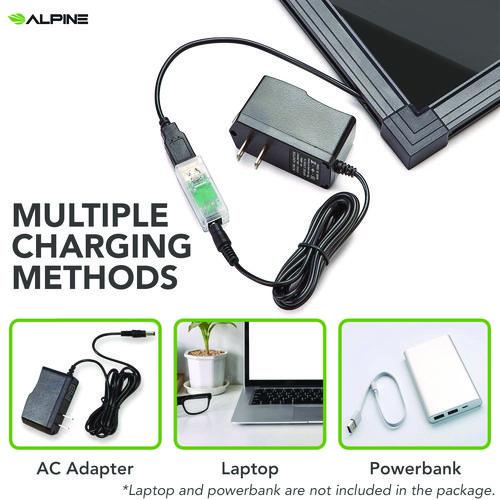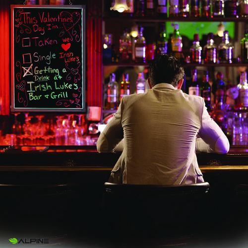 The Alpine Industries LED Illuminated Hanging Message Writing Board features a glowing neon notice sign with 48 different flashing display styles. With a main panel made of high-quality tempered glass fitted in a durable aluminum frame, this LED writ- Can be used vertically or horizontally with hanging chain.